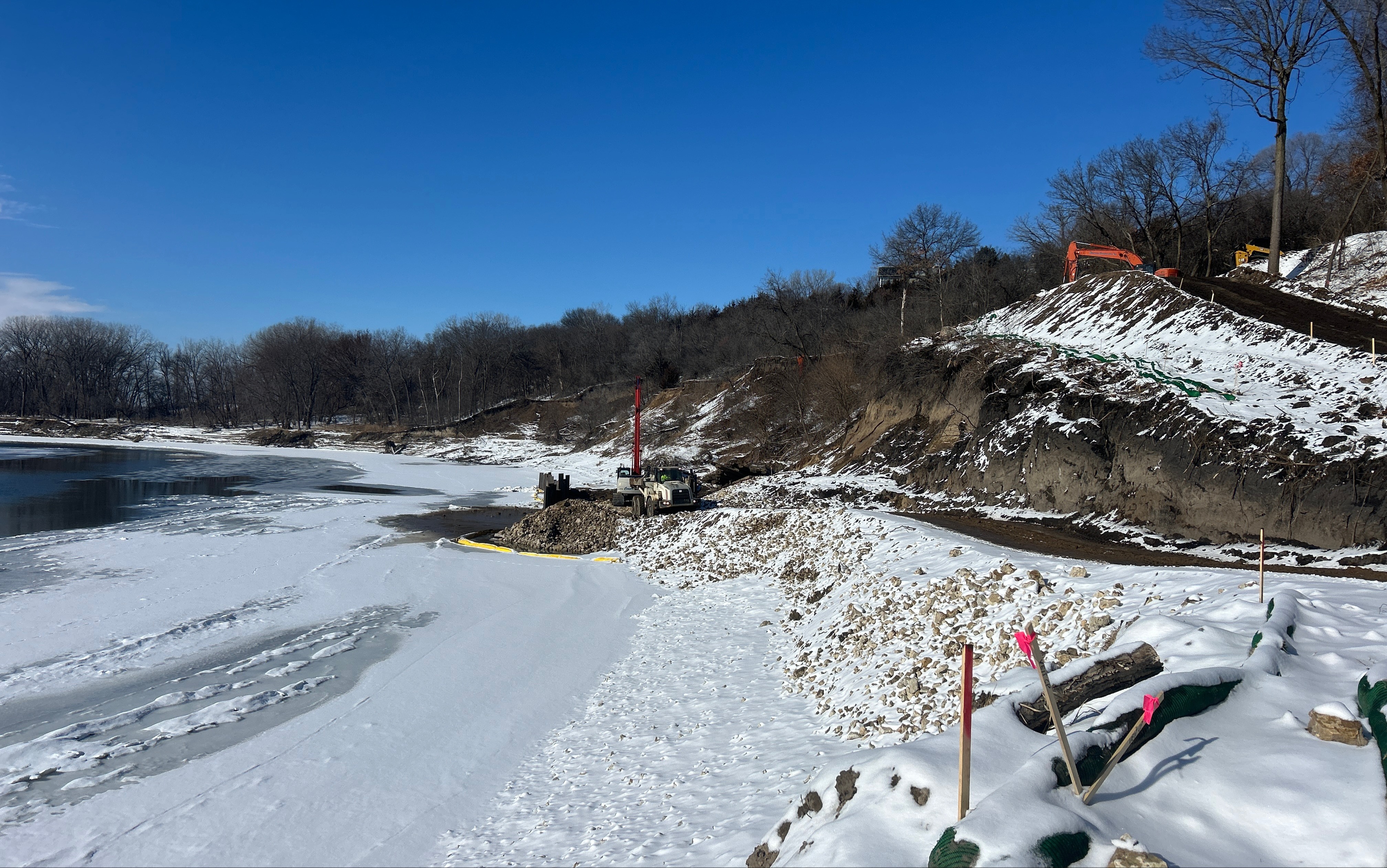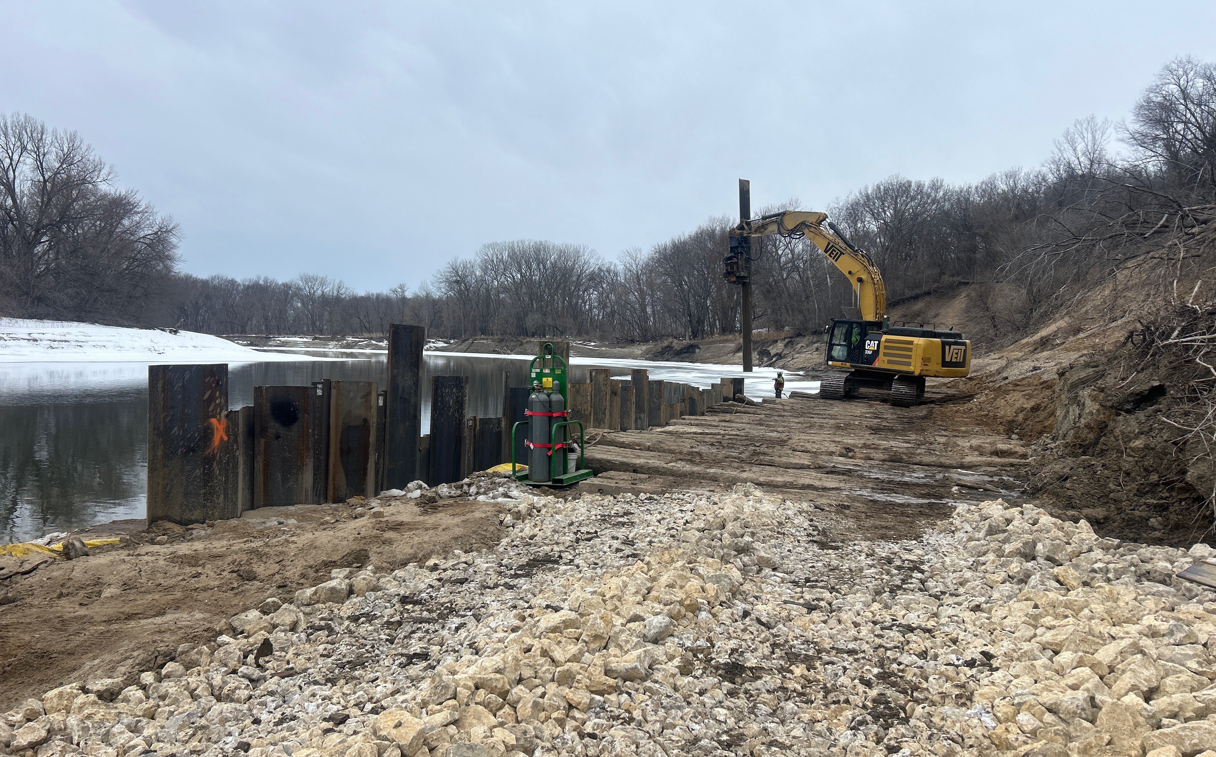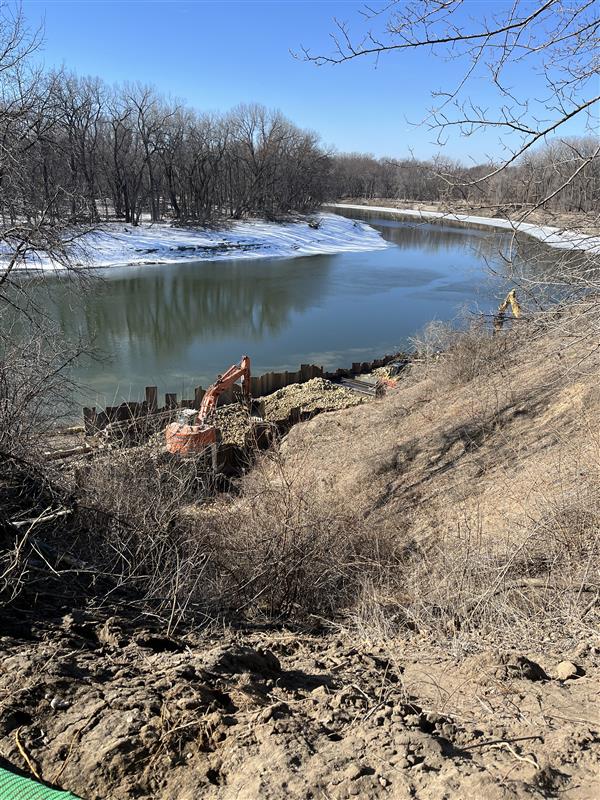 December 15, 2025: The access road, staging area, and ramp from the staging area to the riverbank were completed. Sunram Construction Inc. (Contractor) began excavation and riprap replacement at the east end of Launchable Toe and work westward. The pre-construction survey work is complete, all permits have been obtained, and bio-logs and erosion control measures will be maintained during warmer weather.