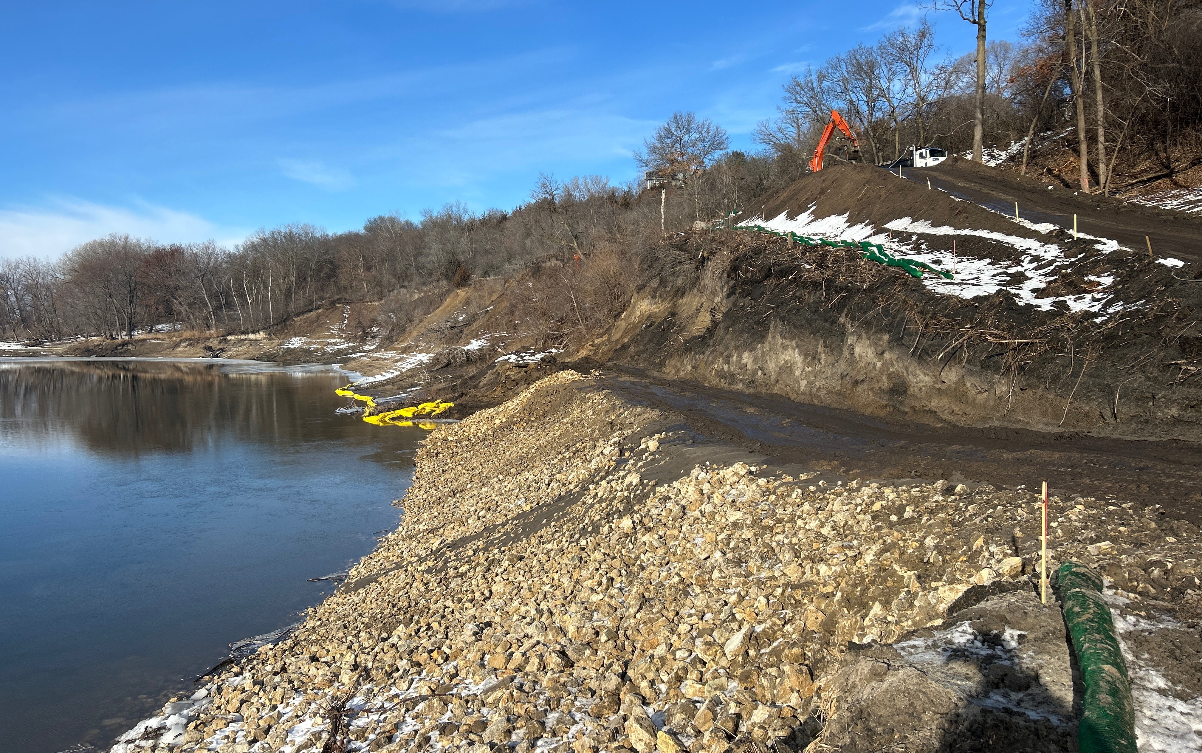 December 15, 2025: The access road, staging area, and ramp from the staging area to the riverbank were completed. Sunram Construction Inc. (Contractor) began excavation and riprap replacement at the east end of Launchable Toe and work westward. The pre-construction survey work is complete, all permits have been obtained, and bio-logs and erosion control measures will be maintained during warmer weather.